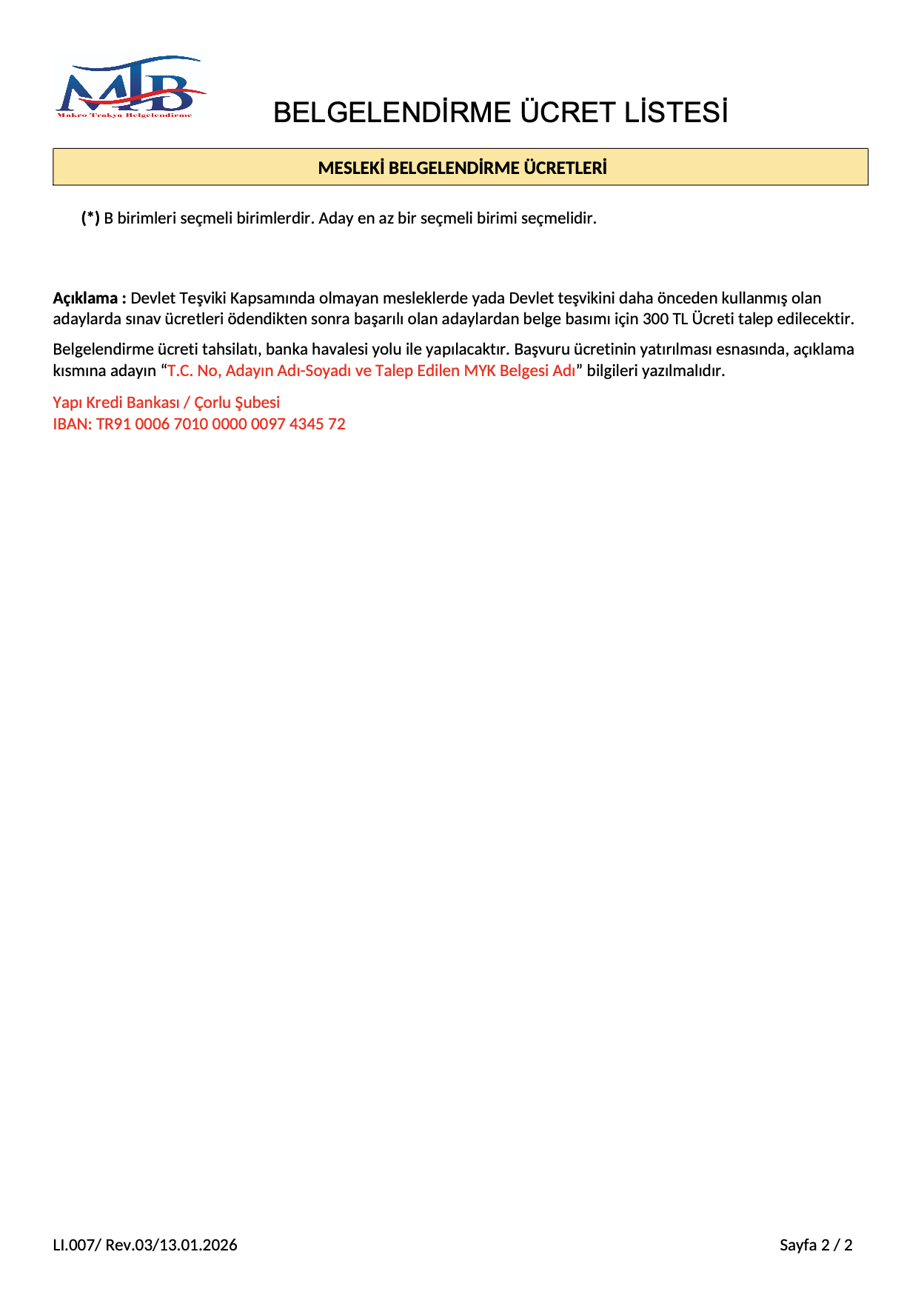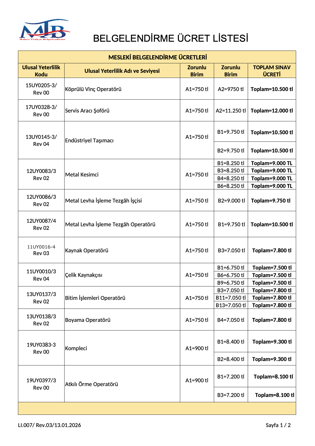 Belgelendirme Ücret Listesi